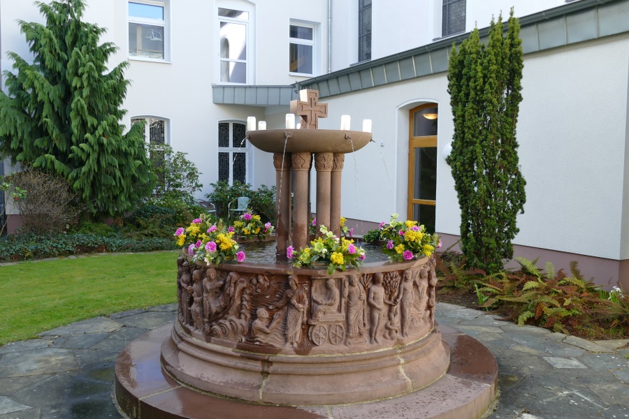 Mit diesem Bild des österlich geschmückten Brunnens aus unserem Kreuzgarten wünschen wir allen Freunden, Gästen und Besuchern eine frohe und gesegnete Osterzeit. Besonders laden wir in diesen Wochen ein zur Mitfeier unserer Gottesdienste.