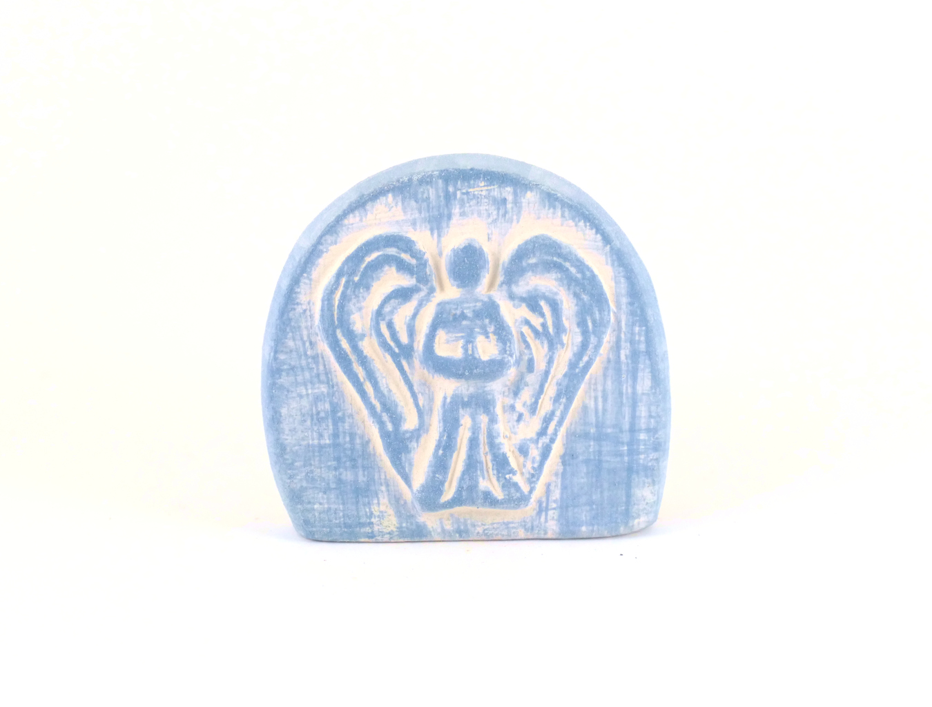 Diesen Kartenhalter mit Engel in weiß, stellen wir in unserer klostereigenen Keramikwerkstatt mit Hilfe von je einer Gipsform für Vorder- und Rückseite von Hand aus weißem Ton her. Dann werden beide Teile zusammengefügt und verputzt. Wenn der Rohling getrocknet ist, tragen wir eine, nach unserem Rezept hergestellte, blaue Tonengobe sorgfältig mit dem Pinsel auf, so dass nur die Erhebungen des Motivs betont werden. Zum Abschluss wird der Kartenständer bei 1120° Grad im Elekroofen gebrannt