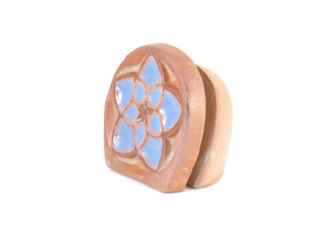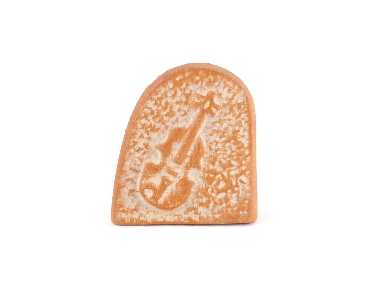 Diesen Kartenhalter mit Geige in rot, stellen wir in unserer klostereigenen Keramikwerkstatt mit Hilfe von je einer Gipsform für Vorder- und Rückseite von Hand aus rotem Ton her. Dann werden beide Teile zusammengefügt und verputzt. Wenn der Rohling getrocknet ist, tauchen wir ihn zunächst in eine, nach unserem Rezept hergestellte, graue Tonengobe. Danach tragen wir dann eine weitere rote Tonengobe sorgfältig mit dem Pinsel auf, so dass nur die Erhebungen des Motivs betont werden. Zum Abschluss wird der Kartenständer bei 1120° Grad im Elekroofen gebrannt