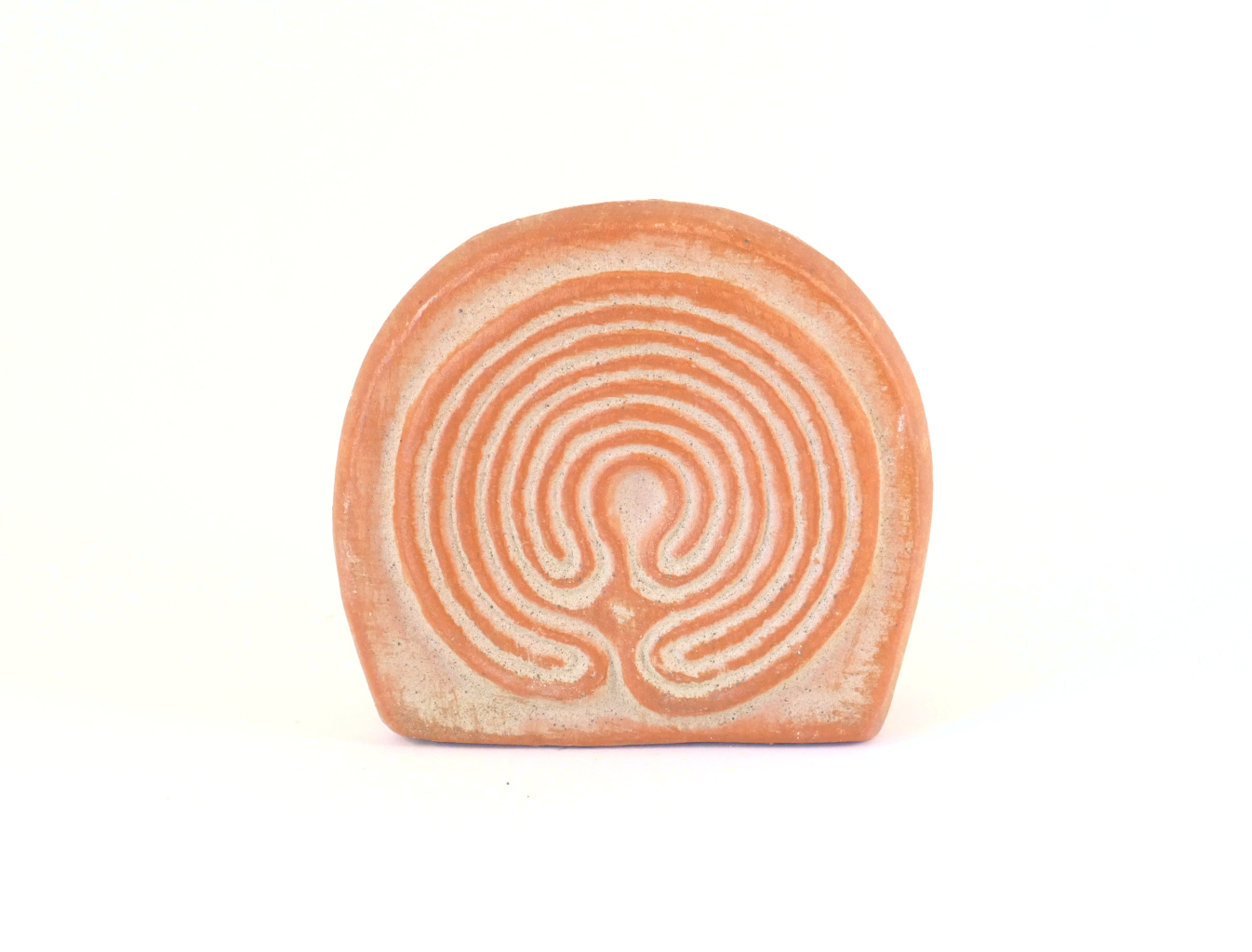 Diesen Kartenhalter Labyrinth in rot, stellen wir in unserer klostereigenen Keramikwerkstatt mit Hilfe von je einer Gipsform für Vorder- und Rückseite von Hand aus rotem Ton her. Dann werden beide Teile zusammengefügt und verputzt. Wenn der Rohling getrocknet ist, tauchen wir ihn zunächst in eine, nach unserem Rezept hergestellte, graue Tonengobe und tragen dann eine weitere rote Tonengobe sorgfältig mit dem Pinsel auf, so dass nur die Erhebungen des Motivs betont werden. Zum Abschluss wird der Kartenständer bei 1120° Grad im Elekroofen gebrannt
