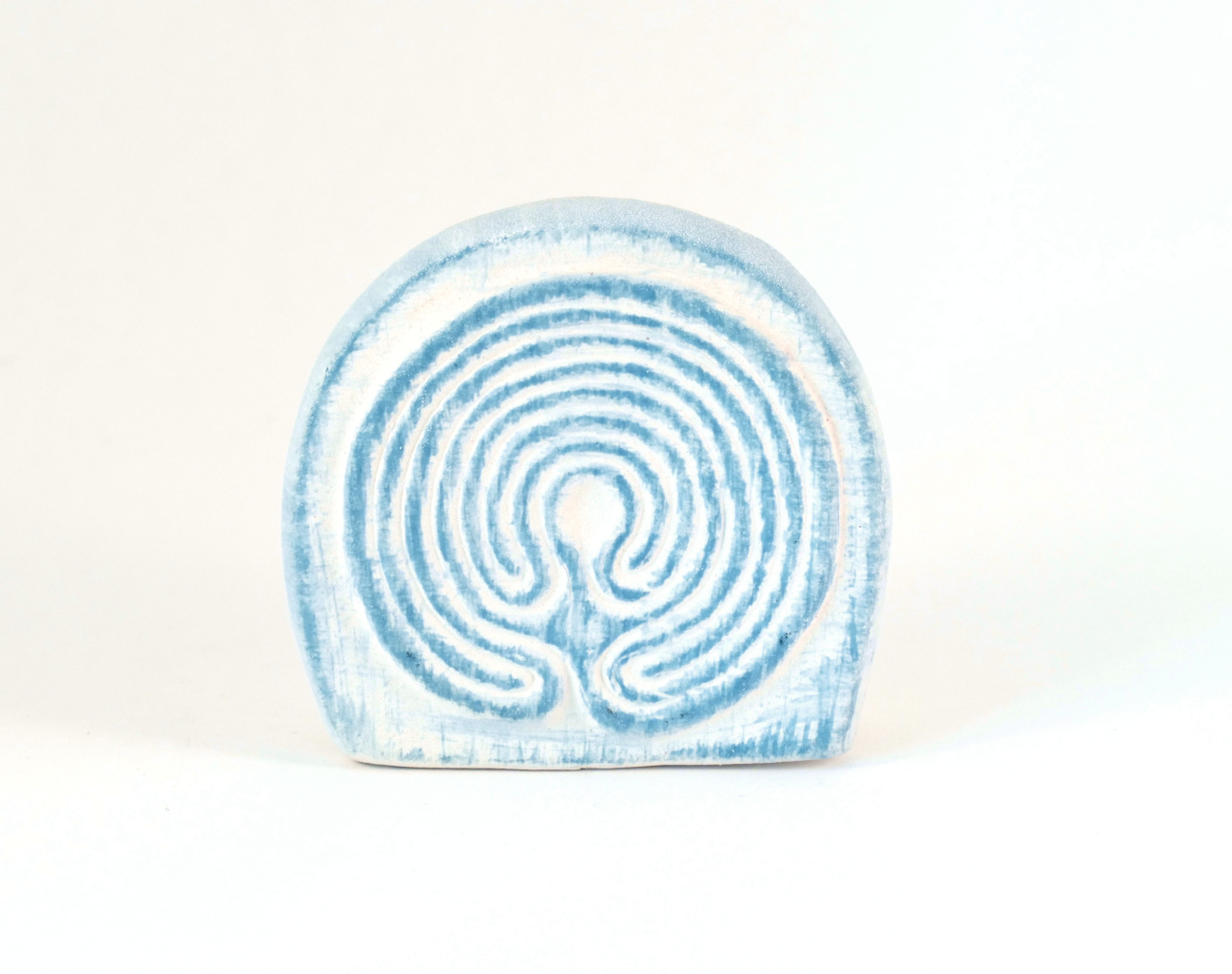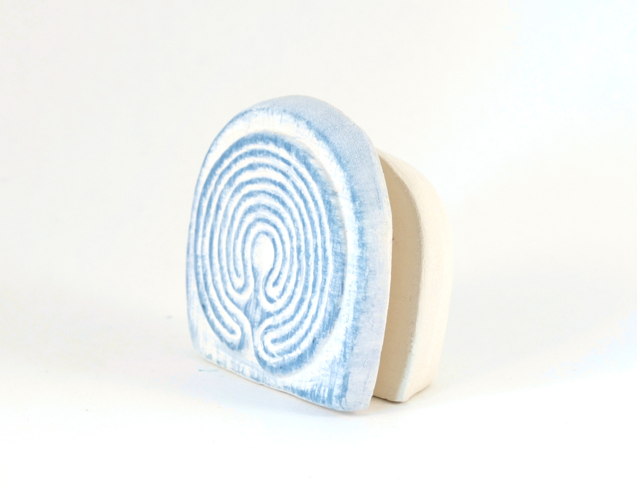 Diesen Kartenhalter mit Labyrinth in weiß, stellen wir in unserer klostereigenen Keramikwerkstatt mit Hilfe von je einer Gipsform für Vorder- und Rückseite von Hand aus weißem Ton her. Dann werden beide Teile zusammengefügt und verputzt. Wenn der Rohling getrocknet ist, tragen wir eine, nach unserem Rezept hergestellte, blaue Tonengobe sorgfältig mit dem Pinsel auf, so dass nur die Erhebungen des Motivs betont werden. Zum Abschluss wird der Kartenständer bei 1120° Grad im Elekroofen gebrannt