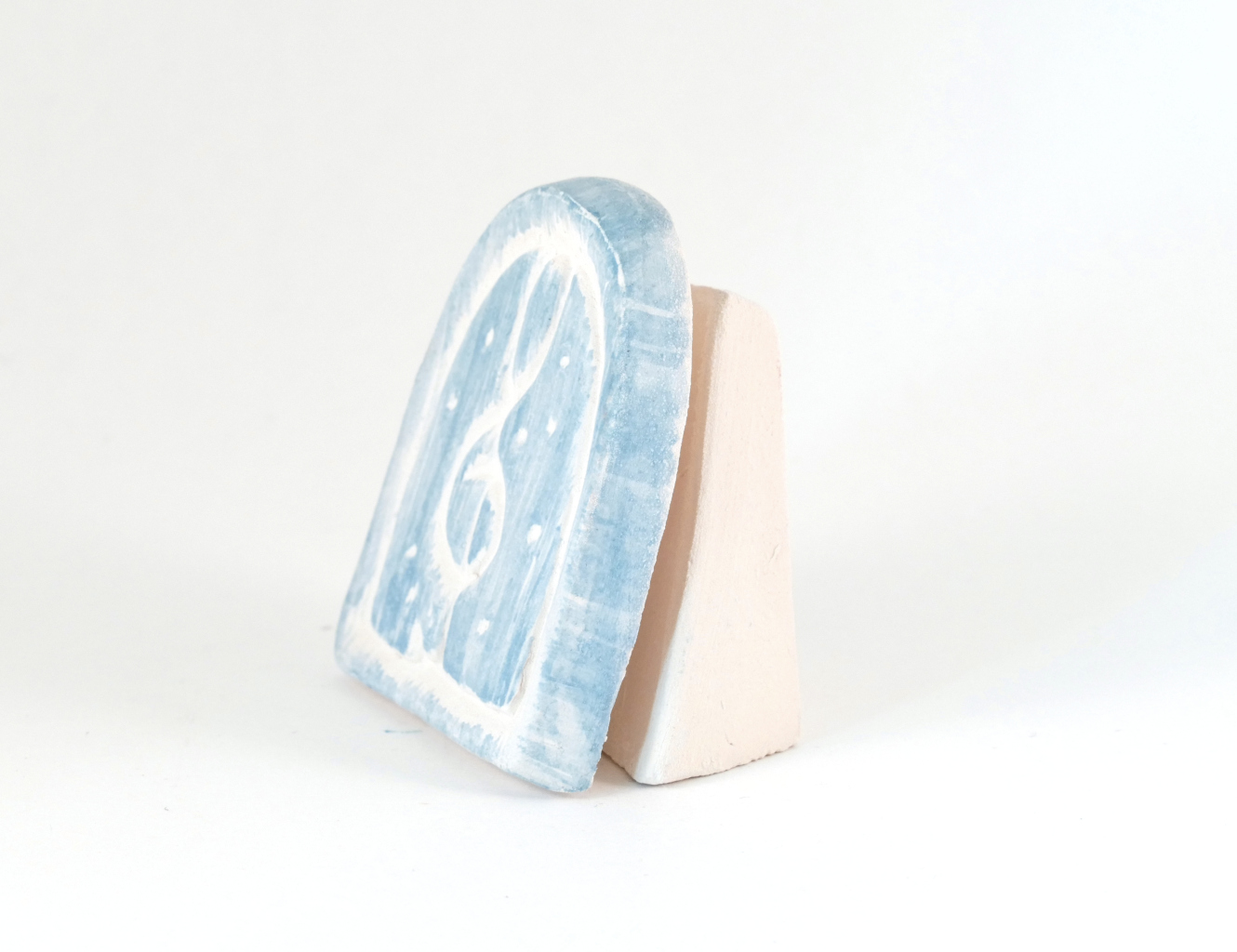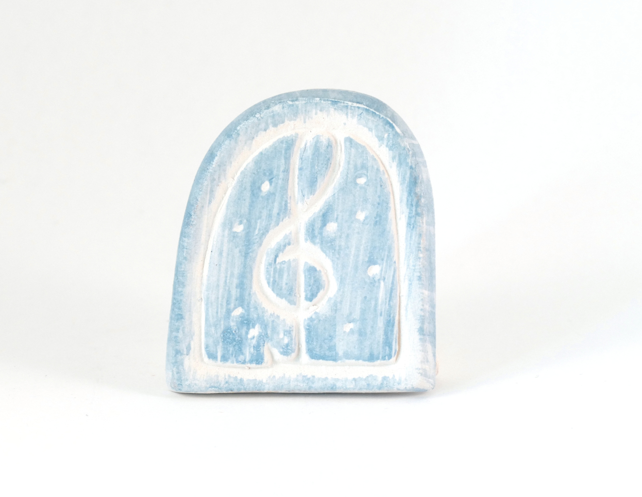 Diesen Kartenhalter mit Notenschlüssel in weiß, stellen wir in unserer klostereigenen Keramikwerkstatt mit Hilfe von je einer Gipsform für Vorder- und Rückseite von Hand aus weißem Ton her. Dann werden beide Teile zusammengefügt und verputzt. Wenn der Rohling getrocknet ist, tragen wir eine, nach unserem Rezept hergestellte, blaue Tonengobe sorgfältig mit dem Pinsel auf, so dass nur die Erhebungen des Motivs betont werden. Zum Abschluss wird der Kartenständer bei 1120° Grad im Elekroofen gebrannt