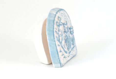 Diesen Kartenhalter mit Rosette in weiß. stellen wir in unserer klostereigenen Keramikwerkstatt mit Hilfe von je einer Gipsform für Vorder- und Rückseite von Hand aus weißem Ton her. Dann werden beide Teile zusammengefügt und verputzt. Wenn der Rohling getrocknet ist, tragen wir eine, nach unserem Rezept hergestellte, blaue Tonengobe sorgfältig mit dem Pinsel auf, so dass nur die Erhebungen des Motivs betont werden. Zum Abschluss wird der Kartenständer bei 1120° Grad im Elekroofen gebrannt