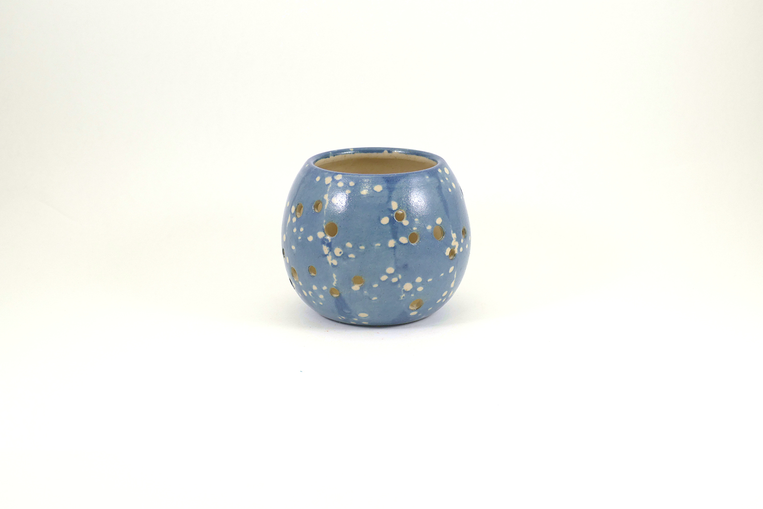 Machen Sie es sich gemütlich mit diesem kleinen Windlicht aus spülmaschinenfestem Steinzeug mit Dekor in blau gesprenkelt.