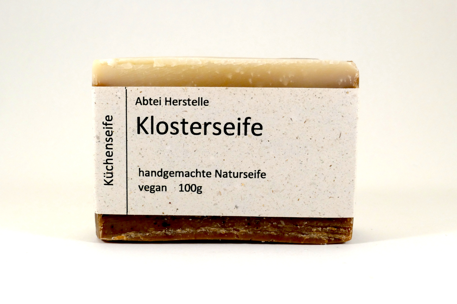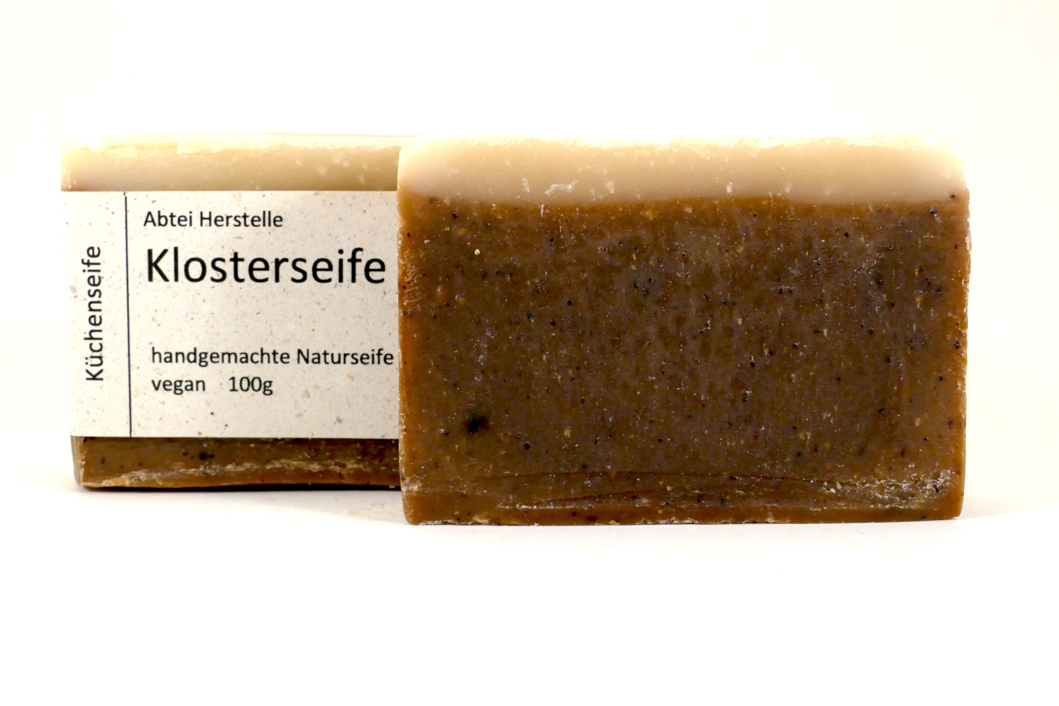 In der Seifenmanufaktur unseres Klosters fertigen wir in reiner Handarbeit Seifen aus hochwertigen Pflanzenölen im schonenden Kaltverfahren. Durch das natürlich enthaltene Glycerin sowie einen Überfettungsgrad von 6-9%, sind diese mit großer Sorgfalt hergestellten Klosterprodukte besonders hautpflegend. Dies garantiert eine milde Reinigung und sanfte Pflege selbst anspruchsvoller Haut. Nach Abschluss des aufwendigen Herstellungsverfahrens reifen unsere Seifen 4-6 Wochen. Dadurch werden sie noch sanfter und hautfreundlicher, aber auch ergiebiger. Liebevoll von Hand mit einer Banderole aus nachhaltigem Graspapier verpackt findet unsere Küchenseife 100g dann den Weg zu Ihnen.