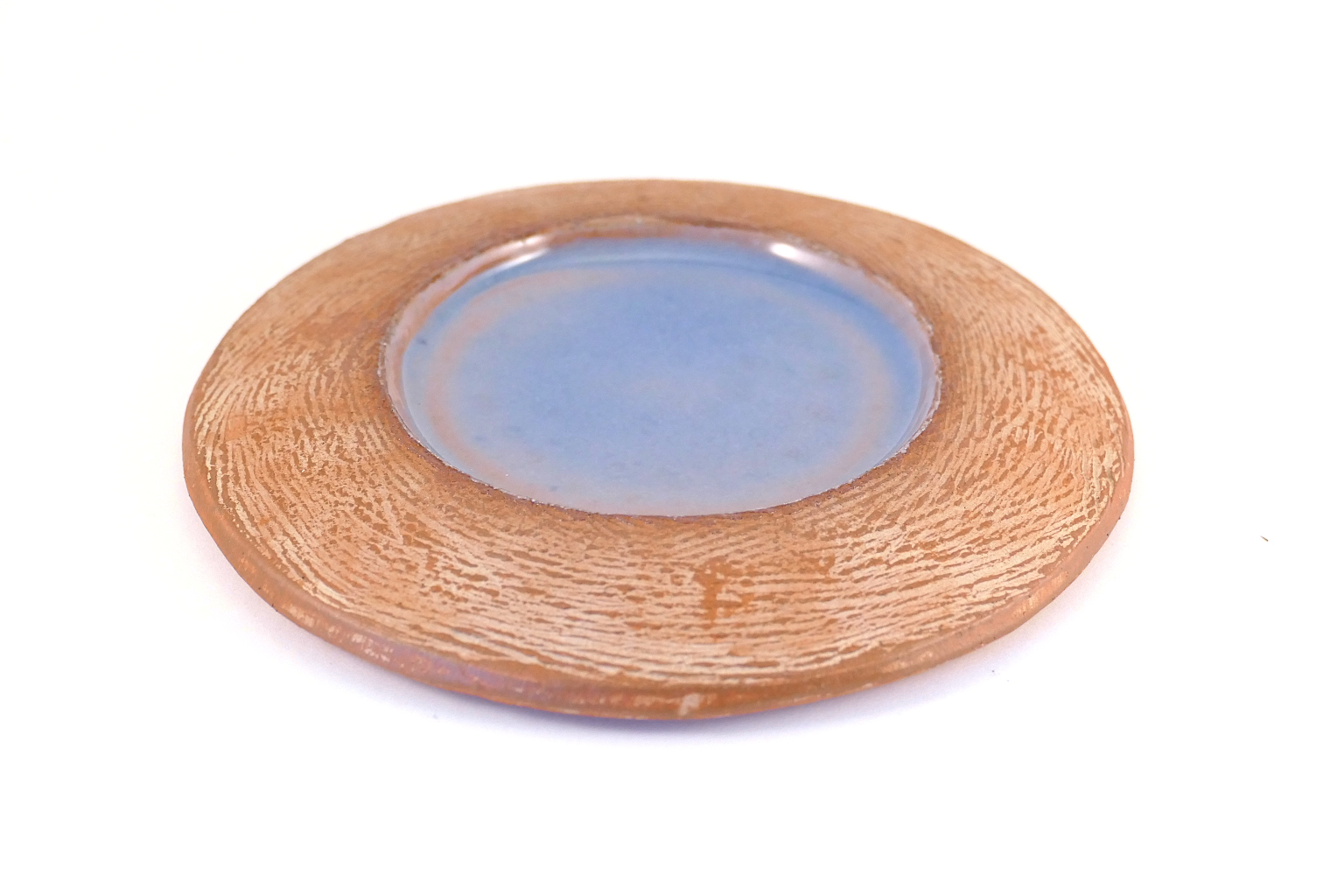 Mittlerer Kerzenteller aus rotem Ton mit Glasur in hellblau auf der Innenfläche. Ideal für Kerzen mit einem Durchmesser von 60 mm.