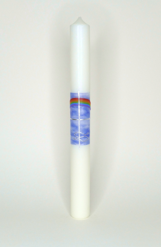 Handgefertigte Taufkerze „Regenbogen Fisch“ , aus unserer klostereigenen Kerzenwerkstatt, inkl. Kerzenbeschriftung.